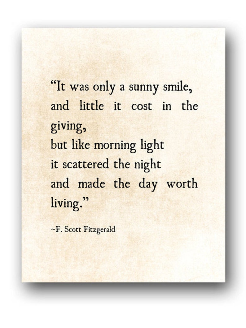 F. Scott Fitzgerald > Quotes > Quotable Quote “It was only a sunny smile, and little it cost in the giving, but like morning light it scattered the night and made the day worth living.” ― F. Scott Fitzgerald01/09/2021 · F. Scott Fitzgerald > Quotes > Quotable Quote “She smiled at him, making sure that the smile gathered up everything inside her and directed it toward him, making him a profound promise of herself for so little, for the beat of a response, the assurance of a complimentary vibration in him.”COPIED. "It was only a sunny smile, and little it cost in the giving, but like morning light it scattered the night and made the day worth living." - F. Scott Fitzgerald.F. Scott Fitzgerald ‘s quote about . It was only a sunny… It was only a sunny smile, and little it cost in the giving, but like morning light it scattered the night and made the day worth living. The Quotes Image The quotes image by F. Scott Fitzgerald.
