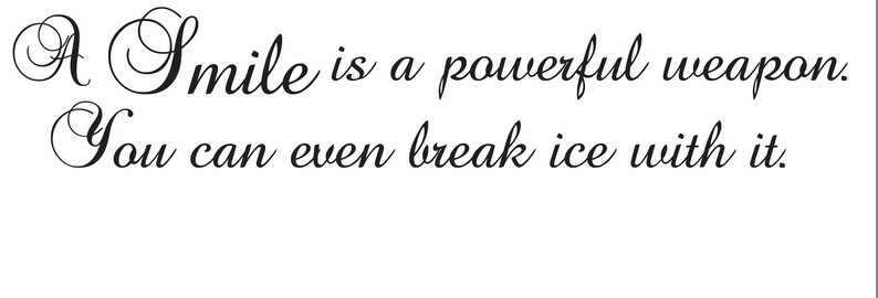 A smile is a language of agreement. A smile is a language of peace. A smile is a language of good looks. A smile is a good weapon.Your father wanted you to have this when you were old enough, but your uncle wouldn't allow it. He feared you might follow old Obi-Wan on some damn fool idealistic crusade like your father did. It's your father's lightsaber. This is the weapon of a Jedi Knight. Not as clumsy or as random as a blaster, but an elegant weapon for a more civilized age.19/05/2016 · A Smile is a Powerful Weapon – Smile Quotes. Savana Linda Luisini June 18, 2016. A smile is a powerful weapon, you can even break ice with it. – Smile Quotes."A smile remains the most inexpensive gift I can bestow on anyone and yet its powers can vanquish kingdoms."22/11/2021 · Smile quotes that will make your day beautiful. 95. “A smile is a powerful weapon; you can even break ice with it.” – Unknown. 96. “Let us always meet each other with smile, for the smile is the beginning of love.” – Steve Maraboli. 97. “Smile; it the second best thing one can do with one’s lips.” – Unknown. 98.“The greatest weapon that one can have is a simple...smile.” ― Lionel Suggs06/03/2018 · A smile is an inexpensive way to change your looks. Charles Gordy. The flower in the vase smiles, but no longer laughs. Malcolm De Chazal. A smile is a powerful weapon; you can even break ice with it. Unknown Click to tweet. If you’re reading this… Congratulations, you’re alive. If that’s not something to smile about, then I don’t know what is.Jean Anouilh. Life is full of beauty. Notice it. Notice the bumble bee, the small child, and the smiling faces. Smell the rain, and feel the wind. Live your life to the fullest potential, and fight for your dreams. Ashley Smith. The best part of beauty …When times are tough, dare to be tougher. When love hurts you, dare to love again. When someone is hurting, dare to help them heal. When another is lost, dare to help them find the way. When a friend falls, dare to be the first to extend a hand. When you cross paths with another, dare to make them smile.