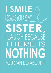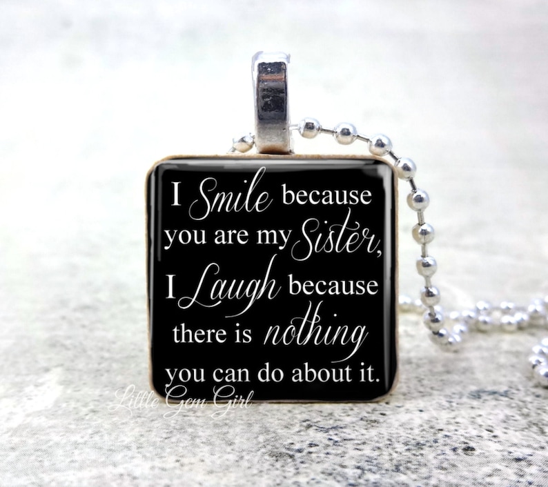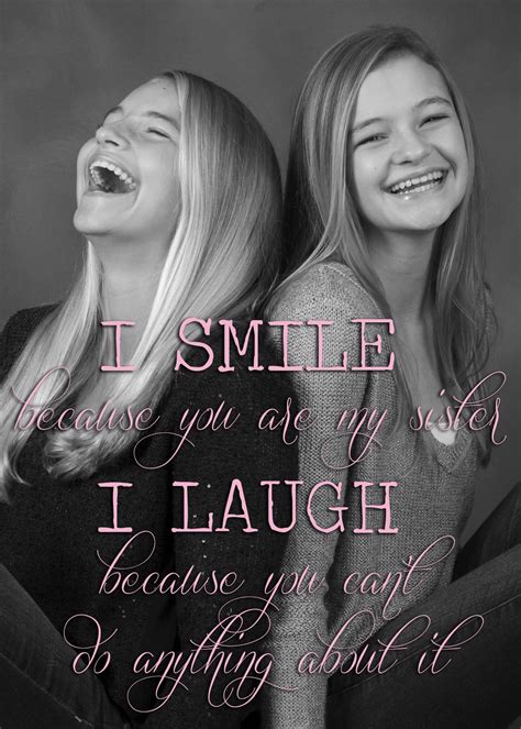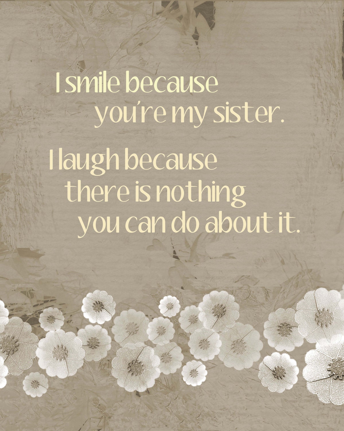 Younger Sister quotes. You have the sweetest and the cutest smile I have ever seen. I wish to always see you with that smiling face, which brightens up our day. I love you, my sister and I wish you a very happy and warm birthday. May you achieve big things in life.Funny Sister Quotes. I smile because you are my sister, I laugh because there is nothing you can do about it! Never let an angry sister comb your hair. You and I are sisters always remember that if you fall I will pick you up, as soon as I finish laughing.26/03/2021 · 34. “A sister smiles when one tells stories—for she knows where the decoration has been added.” – Chris Montaigne. 35. “Look inside any sister relationship and you’ll find a wealth of interesting stories.” – Colleen Sell12/01/2022 · Funny Quotes on Sister that Bring a Smile to her Face. Here are some of the Best Funny Quotes on Sister that Bring a Smile to her Face. If you are with your sister, there is always a boyfriend and a crazy sister behind her … The sisters of the cookie of life are chocolate chips. Your sister knows when you can be better or worse than Santa.26/08/2020 · 60. You have no reason for loving me, yet you do anyway; that’s true love and I pray never to lose it. I love you, my sister. Heart Touching Quotes for Elder Sister. Elder sisters strive to be there for their younger ones at all times. All they need is your appreciation that acknowledges all their efforts.01/01/2022 · Sister, you are the greatest gift that I will ever have and my heart will ever know. A loyal sister like you is worth a million friends. To my lovely sister, my best friend, you mean the world to me. I dearly love you. The greatest gift that my parents gave me is you, my sister. Sisters are angels who help us to fly when our wings cannot carry us.